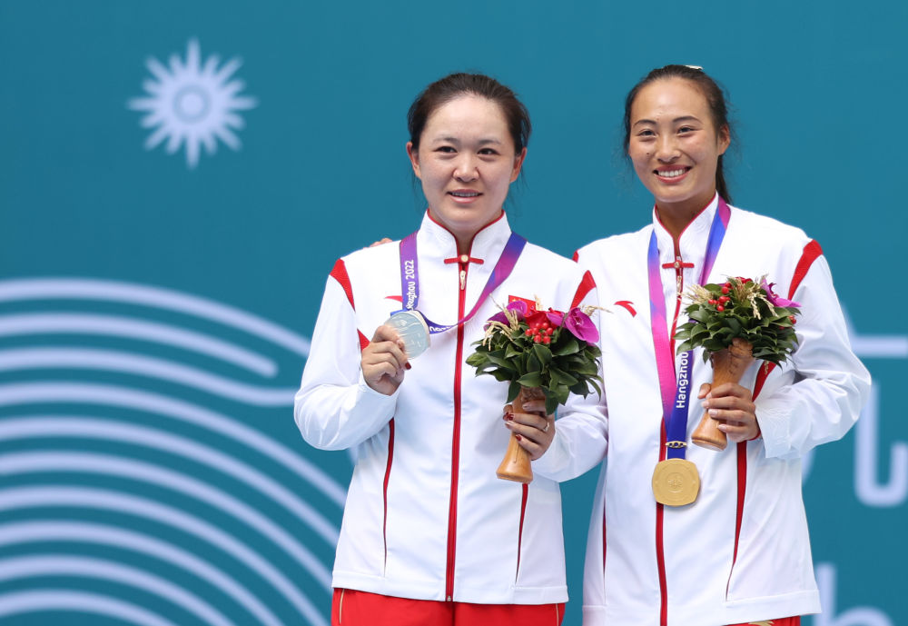 9月29日,冠军中国选手郑钦文(右)与亚军朱琳在颁奖仪式上合影。新华社记者 贾浩成 摄