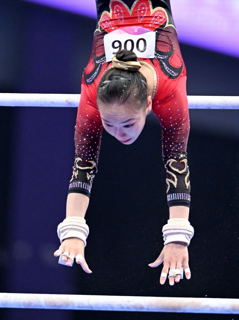 9月25日,中国队选手章瑾在高低杠项目中。新华社记者 程敏 摄