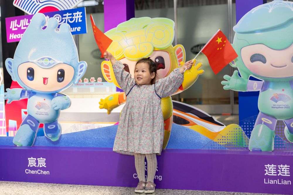 10月1日,小朋友在上海虹桥火车站候车区挥舞国旗。新华社记者 王翔 摄