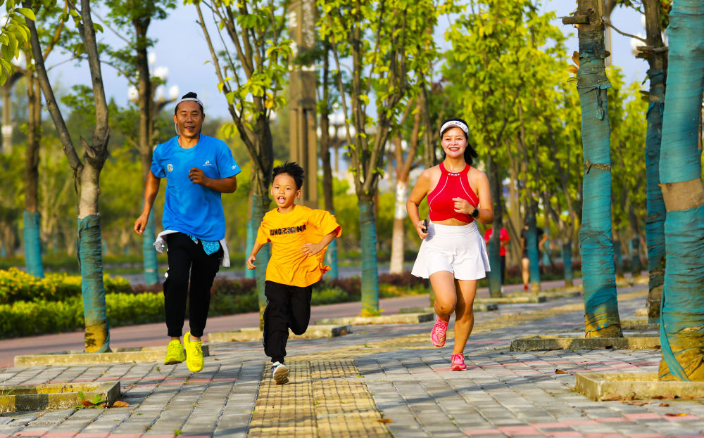 10月1日,人们在贵州省黔西市莲城街道环城林荫路上跑步。新华社发(周训超摄)