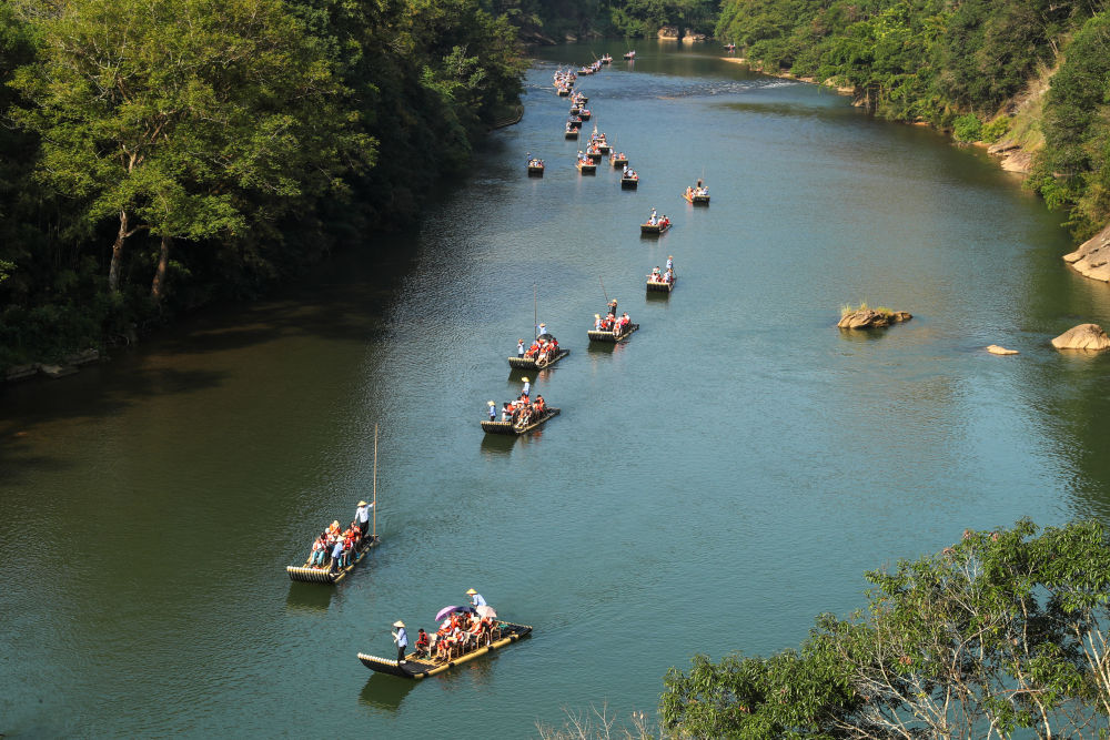 10月1日,游人乘坐竹筏欣赏武夷山国家公园九曲溪两岸风景。新华社发(邱汝泉摄)