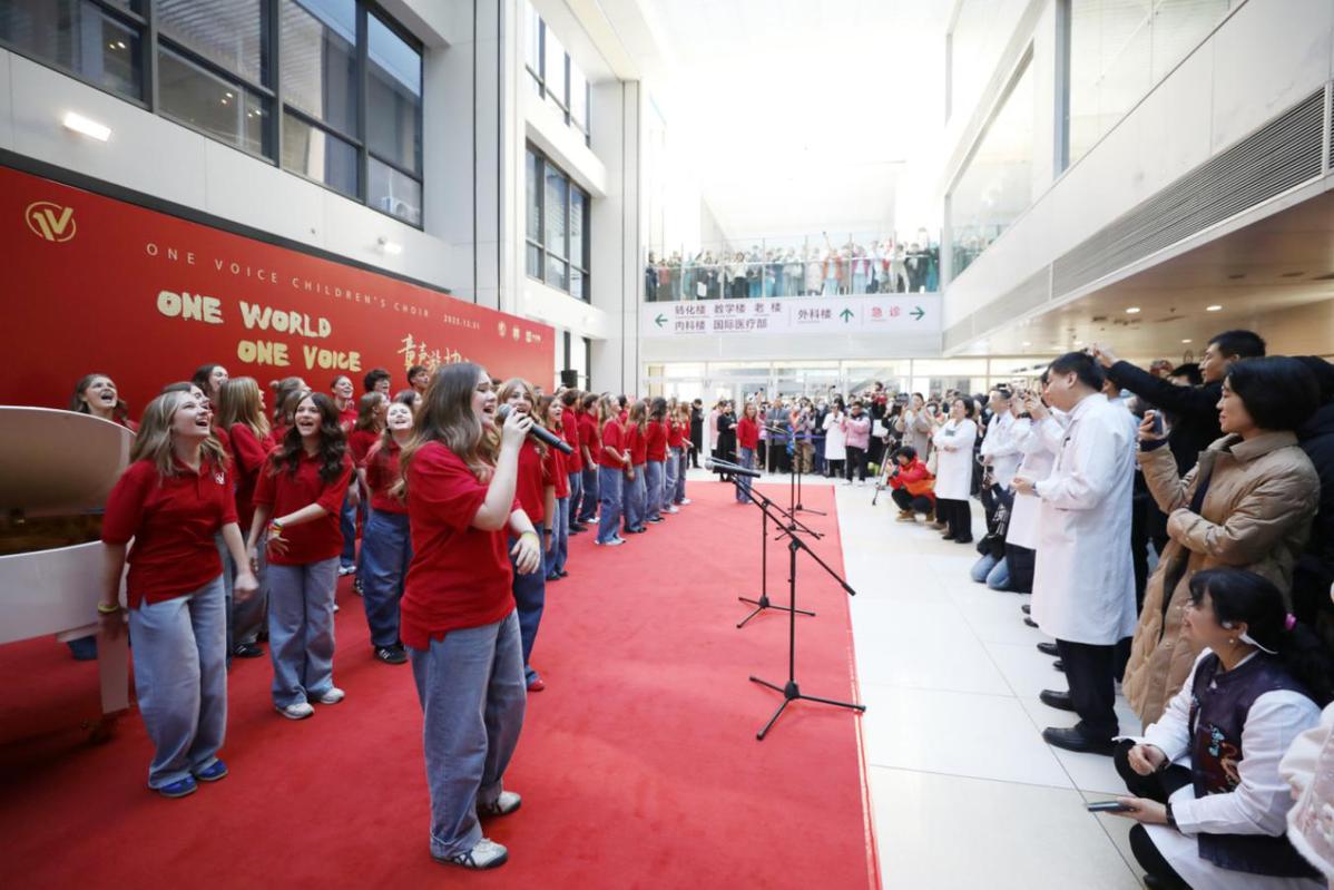 门诊音乐会后,温暖与关怀进一步延伸至住院病房。美国One Voice儿童合唱团分组深入外科楼、儿科病房、产科病房及内分泌科病房区域,为住院患者送去温暖与快乐。