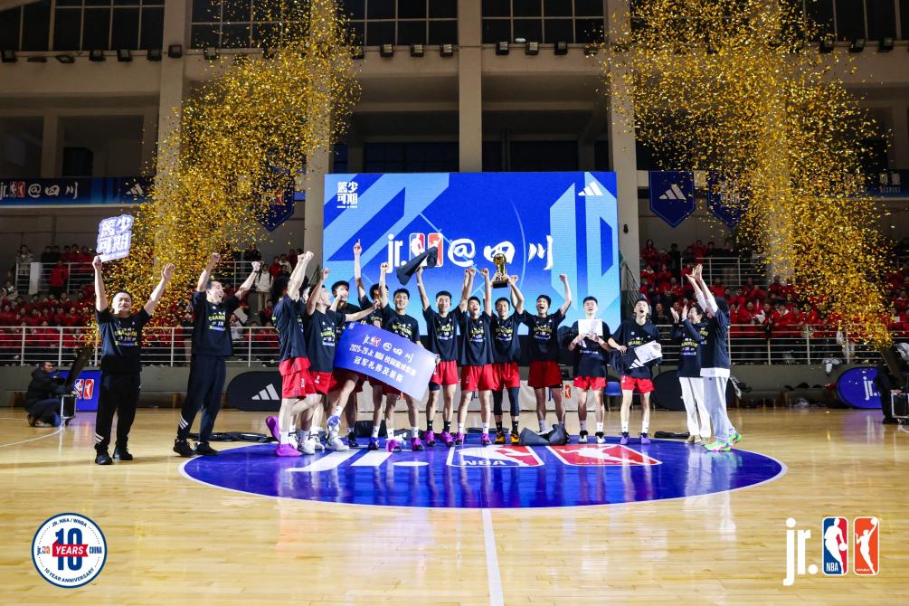 2025-26 Jr. NBA校园篮球联赛@四川 男子组决赛圆满落幕。宜宾一中男篮在两回合激战中表现强势,配合默契,最终以总比分156:146(首回合77:78、次回合79:68)战胜绵阳中学男篮,以10分净胜优势捧起冠军奖杯!这是宜宾一中男篮继2018赛季、2022-23赛季后第三次捧起Jr. NBA冠军杯。