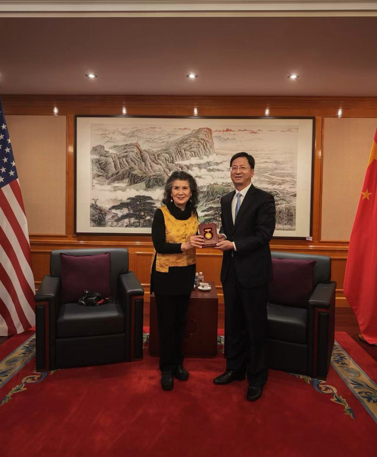 中国驻旧金山总领事张建敏向何曼礼转交“中国人民抗日战争胜利80周年纪念章“,何曼礼代表先父接受了奖章。