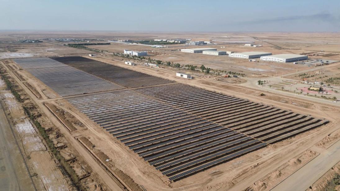 米桑油田光伏项目占地19万平方米,年发电量超1900 万千瓦时,可为油田生产提供稳定绿色电力,大幅降低传统燃气依赖、减少污染物排放,助力伊南部生态保护和能源结构优化。中伊双方建设者精诚协作、攻坚克难,仅用9个月完成项目建设,创下伊拉克同类项目建设速度纪录,得到各方高度评价。