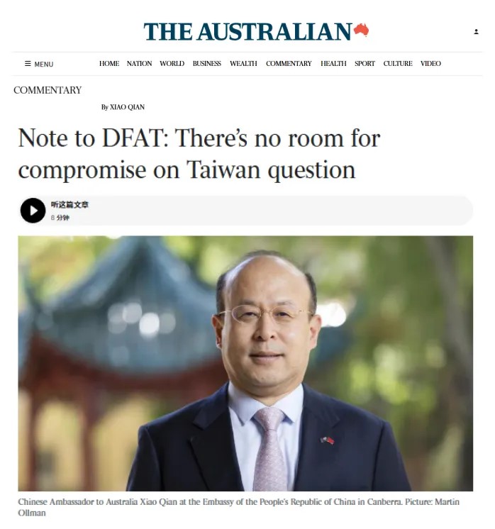 中国日报1月19日电 2026年1月19日,驻澳大利亚大使肖千在澳主流媒体《澳人报》发表题为《尊重事实,信守承诺,顺应历史大势》的署名文章,批驳澳大利亚外交贸易部近期涉台声明,指出一个中国原则是台湾问题最基本的事实,两岸政治对立的“特殊状态”从未改变台湾属于中国的根本属性,“台独”分裂势力和外部势力是破坏台海稳定的罪魁祸首,“对话”决不能成为纵容分裂的借口,呼吁澳方信守承诺,理解和支持中国统一大业。全文如下: