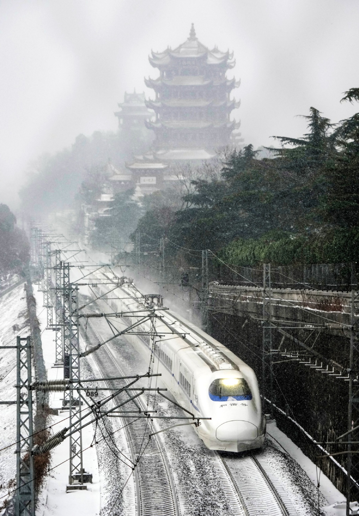 1月20日,湖北武汉,飞奔的高铁列车与黄鹤楼在雪景中交融。周国强 摄