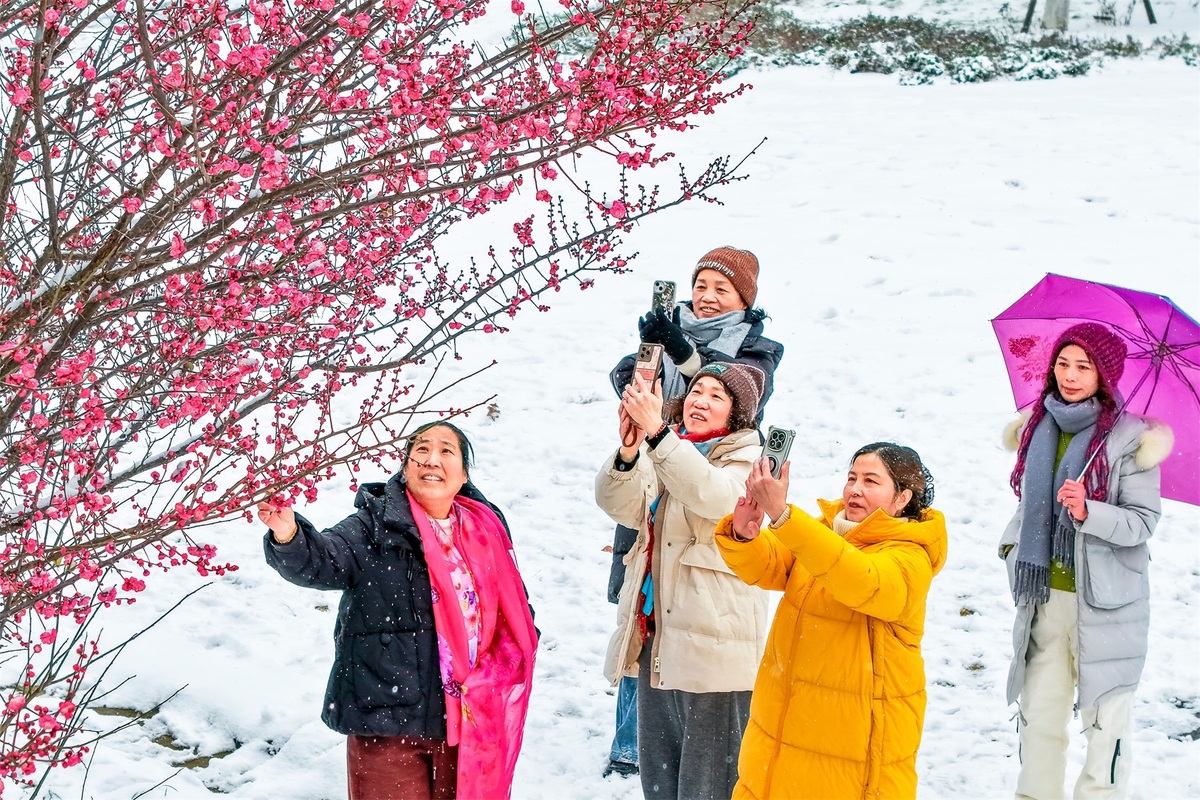 1月20日,湖北浠水,市民拍摄雪中绽放的梅花。王江 摄