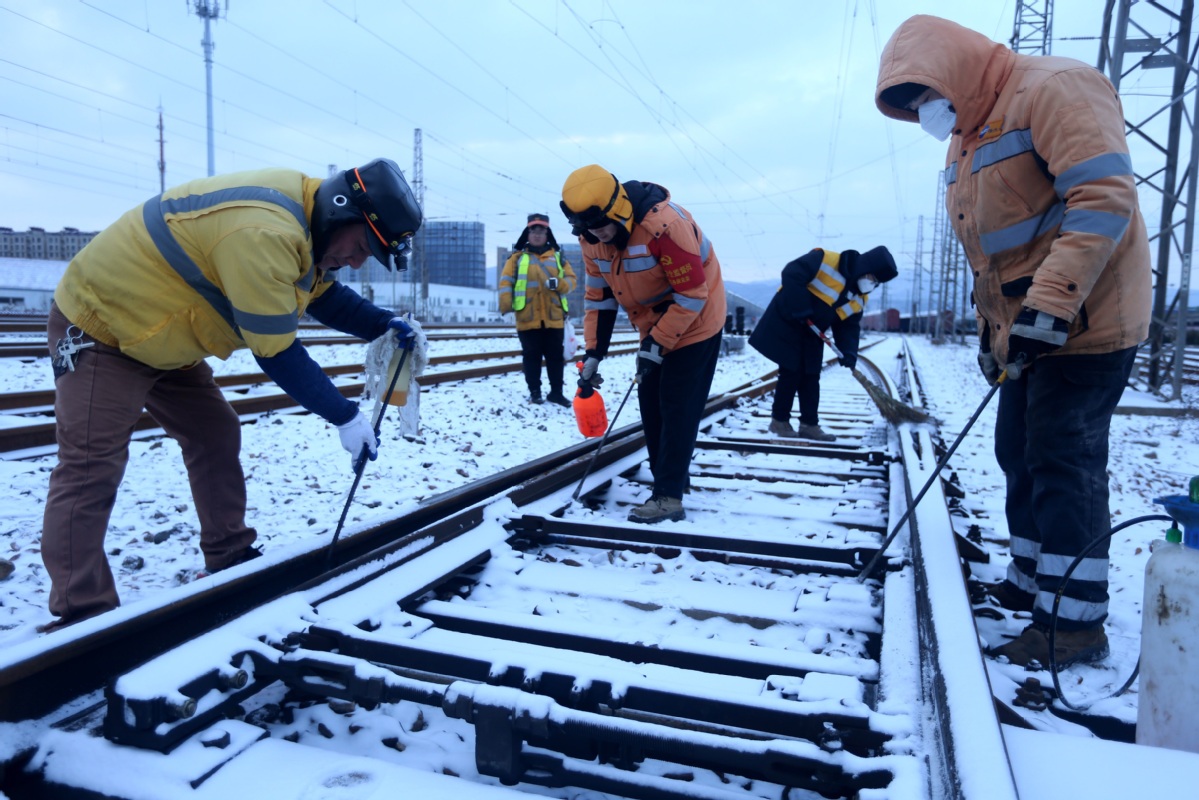 1月20日,江苏连云港东站沿线,工人清扫道岔轨道上的冰雪。王春 摄