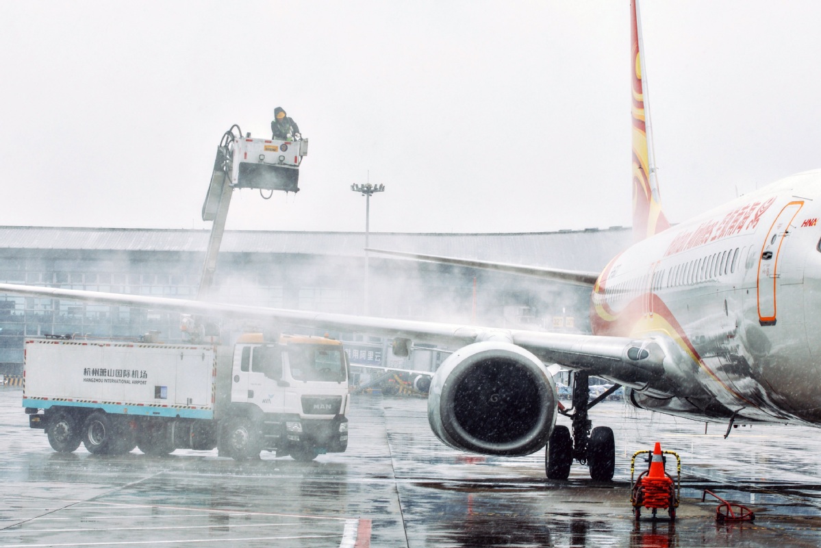 1月20日,浙江杭州,萧山国际机场员工对民航客机进行吹除积雪作业。龙巍 摄