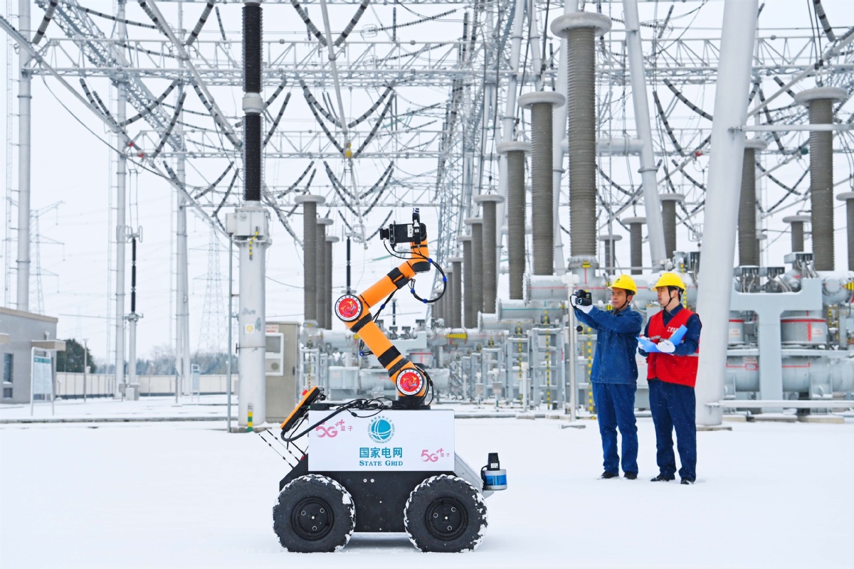 1月20日,安徽滁州,一台5G智能机器人与运维人员对变电主设备进行巡检,确保当地居民生产生活正常用电。宋卫星 摄