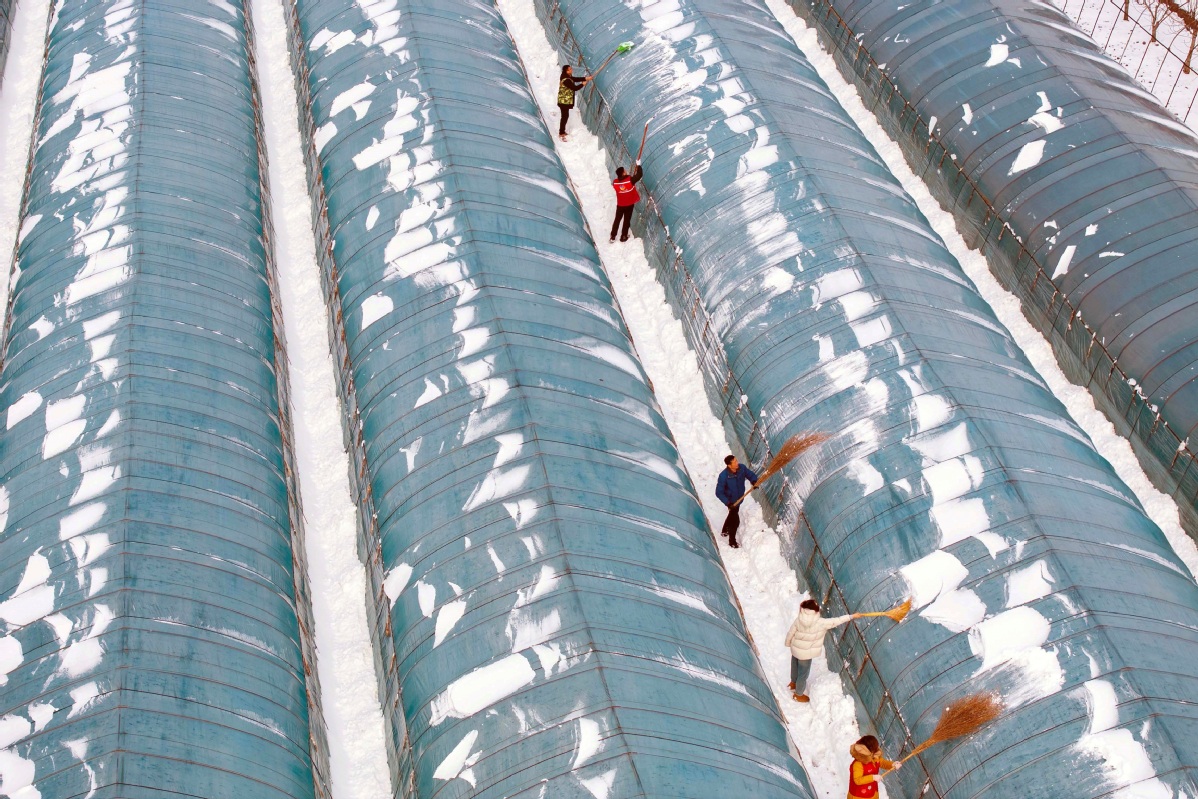 1月20日,江苏泰州,志愿者帮助农户清理果蔬大棚积雪。汤德宏 摄