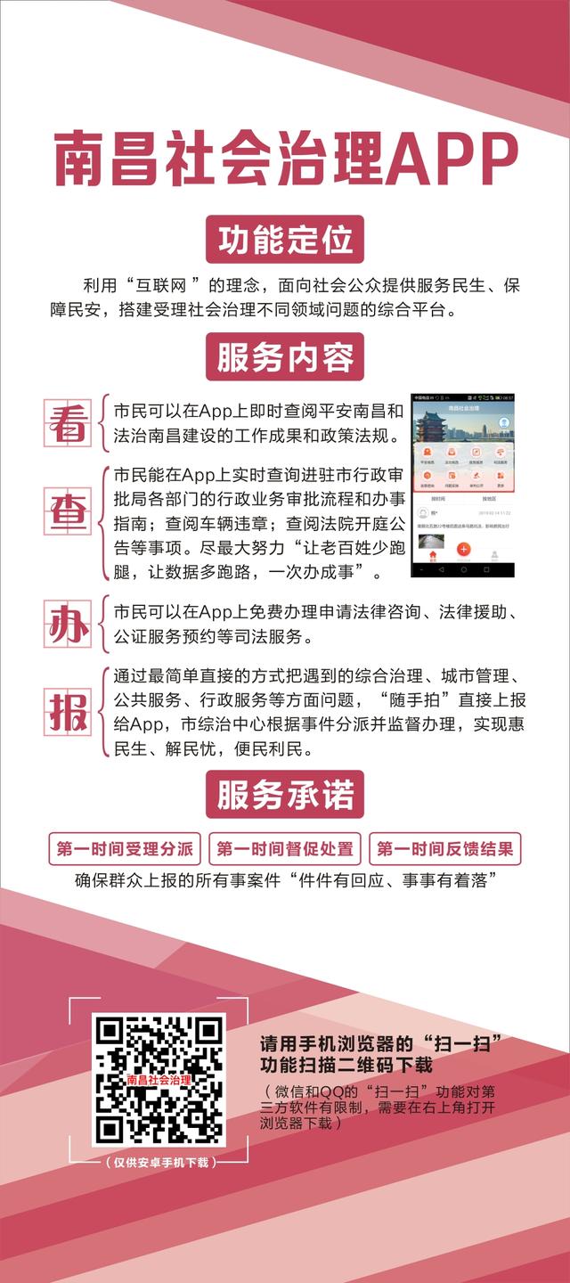 徐宏说,近年来,南昌市的基层社会治理工作不断创新,取得了较好成效,南昌社会治理APP是利用“互联网”的理念,面向社会公众提供服务民生、保障民安的工作平台,在服务内容上,归纳为“一看二查三办四报”。