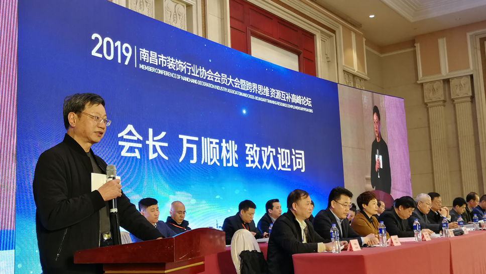 南昌市装饰行业协会会长万顺桃在南昌市装饰行业协会第四届二次会员大会暨“跨界思维、资源互补”高峰论坛峰会上致欢迎辞(章文摄)