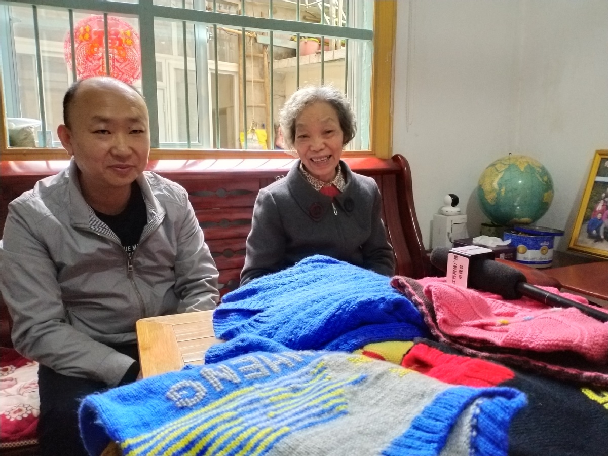 谢芝兰在家给福利院的孩子们编制毛衣,图右为谢芝兰的儿子戴宏秋(章文摄)