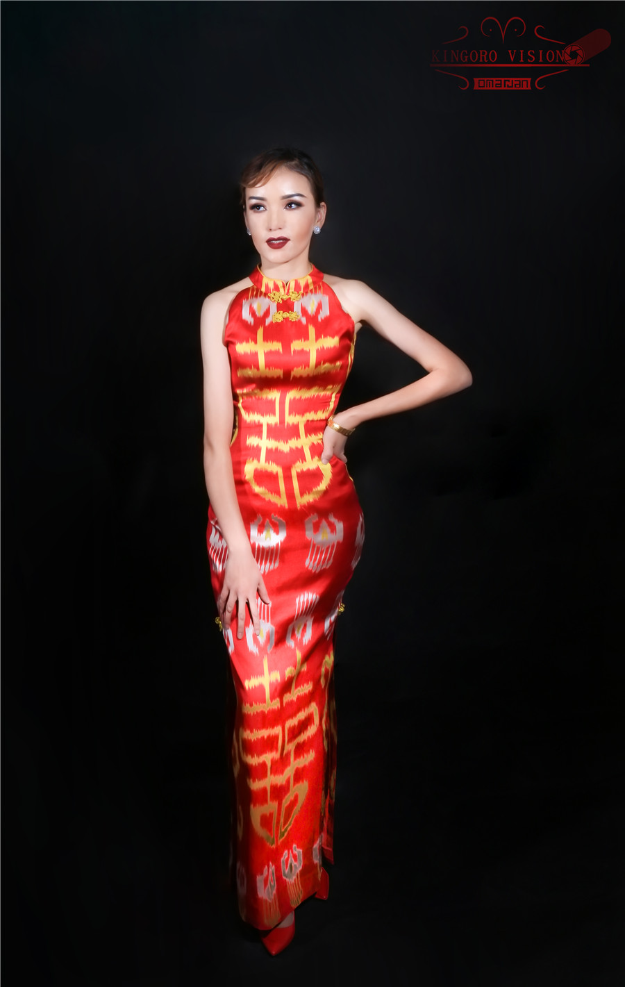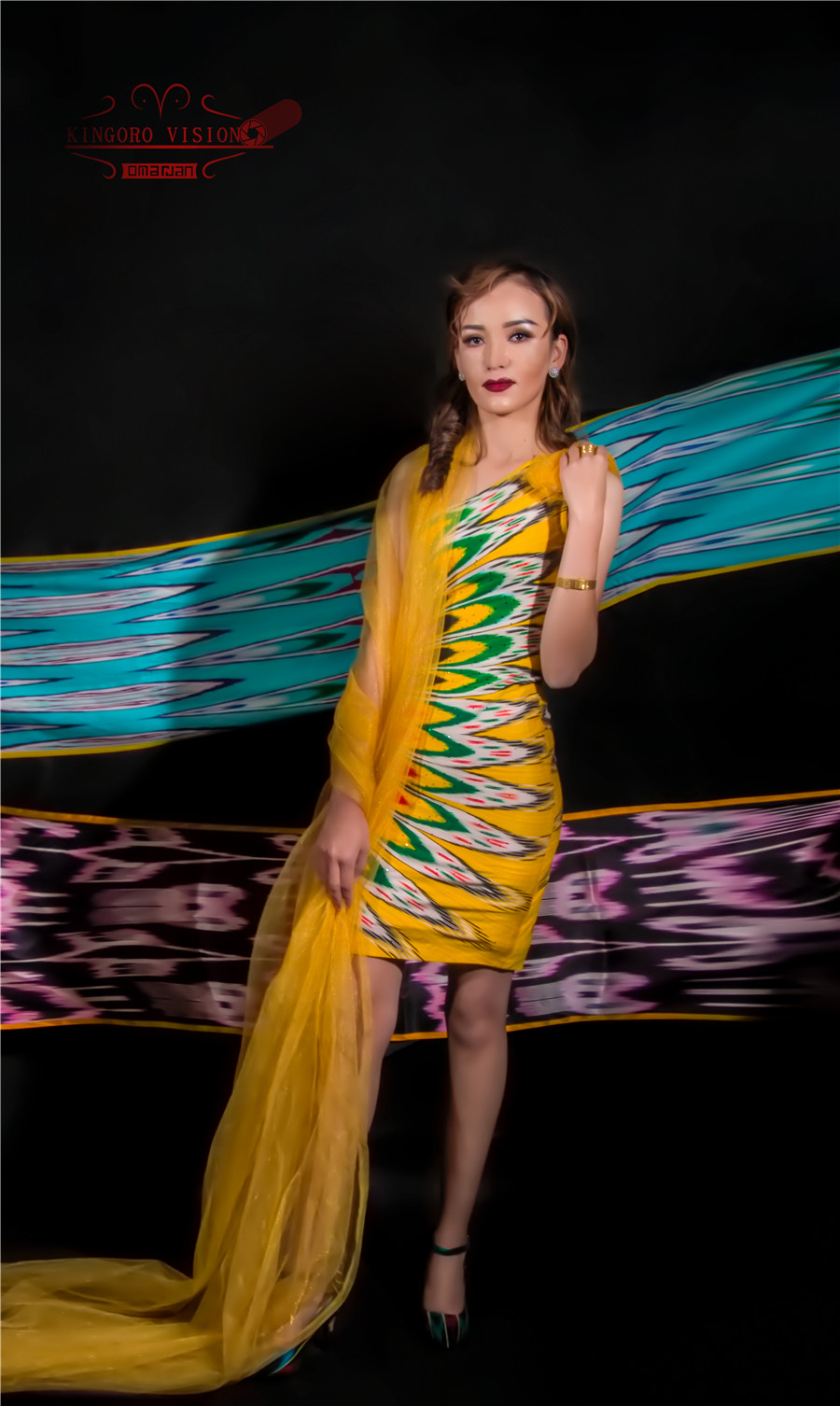 阿孜古丽身材高挑、美丽大方,一身用维吾尔族传统服装面料艾德莱斯设计缝制而成的套裙,在她身上显得热烈而不乏优雅、传统中透着时尚。