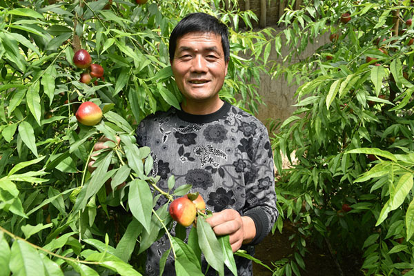 2018年1月,在驻村工作队的帮助下,李新明在温室辣椒地里套种上了520株油桃苗,经过一年多的精心培育,李新明的油桃树已经普遍结果,长势良好。