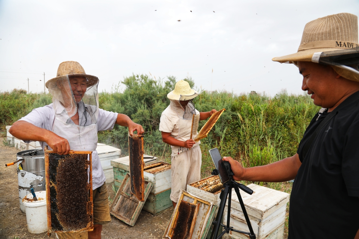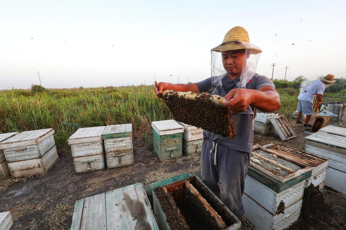 7月4日,在尉犁县墩阔坦乡琼库勒村一处养蜂场,养蜂人任怀备和他的儿子分工协作,照看着十几个蜂箱,熟练的进行取蜜板、割蜂蜡、摇蜜、滤蜜等操作。从早晨8点半到下午7点,经过多次重复的流程,当天出产了近300公斤的罗布麻蜜。