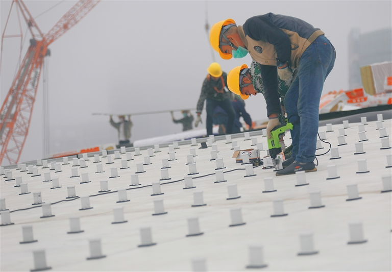 与此同时,在南馆的顶部,十余名工人正在进行着屋面防水的施工。“二期项目的屋面板有5层,每一层都分别具有吸音、防水、装饰等作用,目前施工已经完成了90%,预计4月中旬可以结束屋面板施工。”海南国际会展中心二期项目负责人施志全介绍。