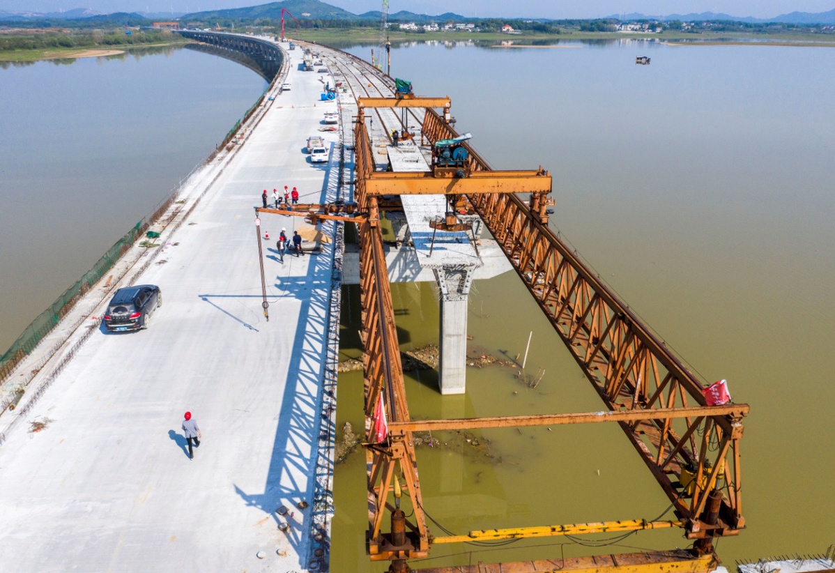 据了解,该桥由中铁十九局承建,是省道S214都昌境内多宝至县城段升级改造工程重点建设项目之一,桥长2292.5米、宽28.5米、设双向六车道,预计今年7月通车。大桥建成后将改善当地区域交通现状,带动鄱阳湖旅游发展。(傅建斌摄影)