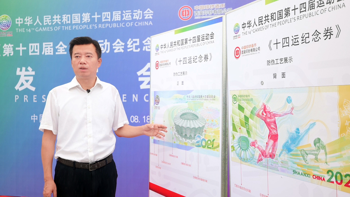 西安印钞有限公司工会主席谭江燕介绍“第十四届全国运动会纪念券”设计理念。纪念券正面背景中巍峨耸立的秦岭山脉环绕着西安奥体中心主场馆,票面整体体现丝绸飘舞的造型,彰显端庄大气飘逸灵动的设计理念和作为丝绸之路起点的特殊意义。“2021”字样结合场馆、火炬、飘带动静结合、竞相呼应,点明了“丝路启航,盛世之花”的主题。背面主景以球类、游泳、田径三名运动员为主体,采用立体透视环形包围设计,通过将不同的平面空间进行交相组合,突出了运动员激情满怀、力争上游、奋力拼搏、追梦圆梦的体育精神。