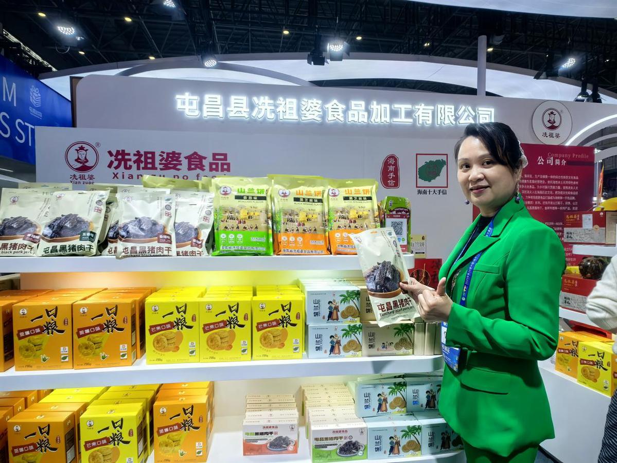 “冼祖婆食品的成功,离不开海南优质农产品的坚实支撑。”屯昌县养猪协会会长黄乙倬介绍,“屯昌猪”作为我国南方优良地方猪种,被列入《中国精品猪品种》,经科学杂交繁育的屯昌黑猪,饲养周期达8至10个月,肉质细嫩、肌间脂肪丰富,油而不腻的独特口感深受市场青睐。依托这一优质食材基础,冼祖婆食品将地方特产与民俗文化相结合,让产品既承载味蕾记忆,更传递文化底蕴。在冬交会4号馆的冼祖婆食品展馆内,络绎不绝的消费者品尝后纷纷点赞.来自东方市的卢先生评价:“粽子包得紧致,食材新鲜,吃完唇齿留香。”