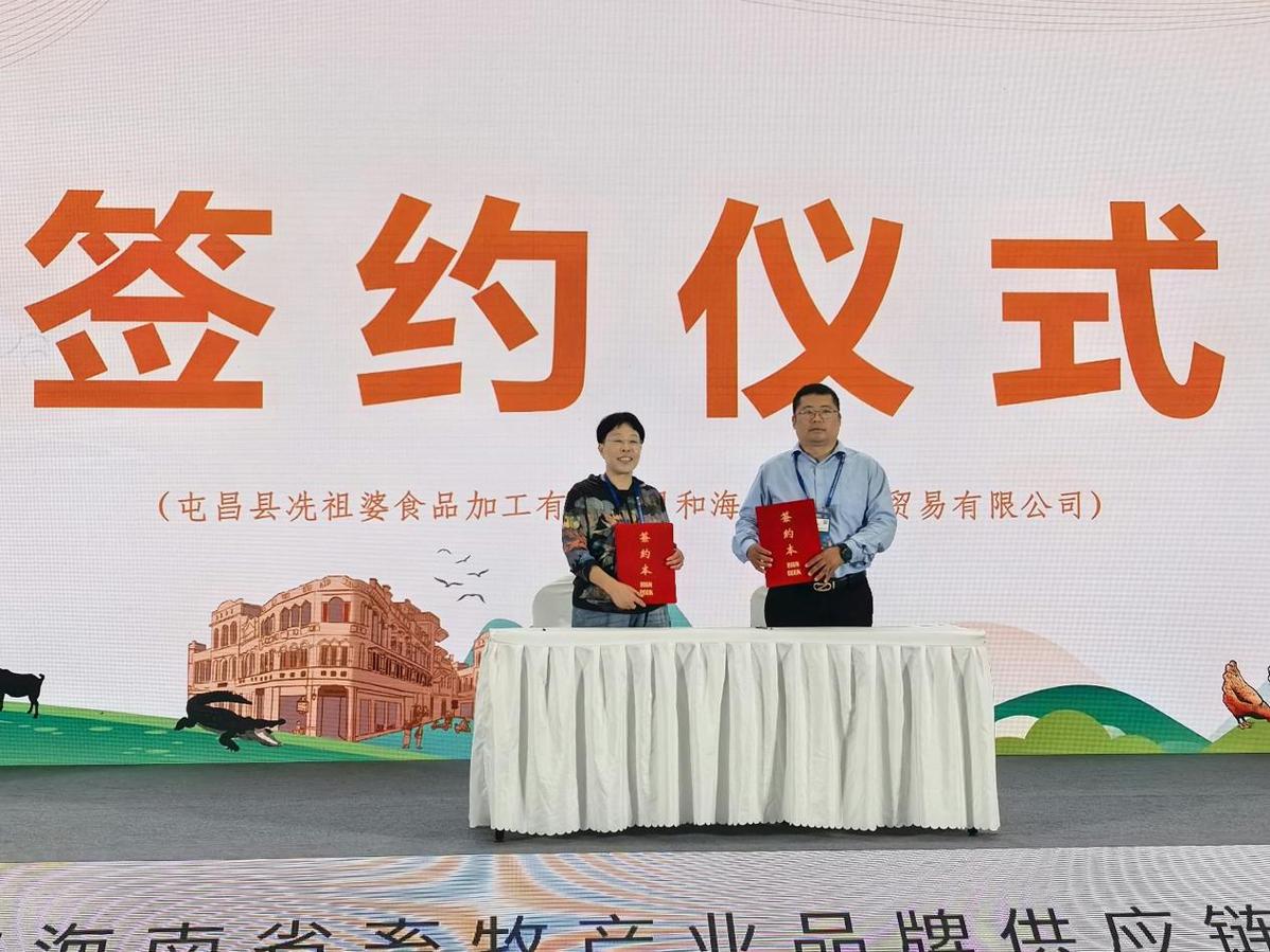 12月5日上午,2025年海南省畜牧产品牌供应链招商推介会上,海南十大手信品牌企业——海南省冼祖婆食品有限公司与海口裕隆丰贸易有限公司达成战略合作,现场签订年销售额300万元的销售协议,涵盖黑猪肉干、腊肠等核心产品。此次签约不仅彰显了海南本土食品品牌的市场竞争力,更成为冬交会助推农产品产销对接、赋能乡村振兴的生动实践。
