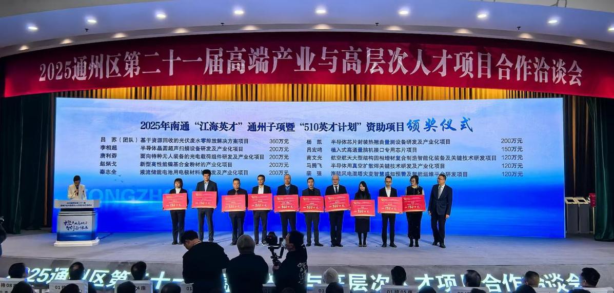 开幕式上,为通州区第十届创新创业大赛获奖项目以及2025年江苏省“双创计划”及“双创博士”、南通市“江海英才计划”、通州区“510英才计划”入选项目代表颁奖。2025年,通州区入选省“双创计划”个人项目9个、团队项目1个、“双创博士”1人,入选数居全市前列、创历史新高。