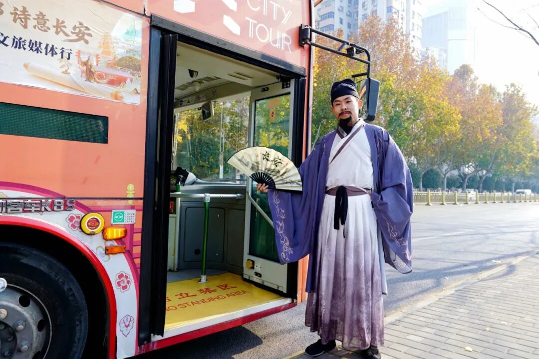 探访途中,全国首辆唐诗主题观光车“长安寻梦”成为移动的文化载体。车厢内点缀着满满的唐诗元素装饰,氛围感十足,更有“李白”“杨贵妃”全程相伴讲解,以全新的情景互动方式讲述“唐朝、长安、名仕”的传奇故事。大唐西市博物馆内,“五陵年少金市东”的诗句与丝路贸易文物相映,让“胡商云集”的场景鲜活再现;兴庆宫公园沉香亭前,牡丹绽放,李白为杨贵妃作《清平调》的典故引人入胜,投壶互动复刻“流觞”雅趣;长安十二时辰街区里,《长安古意》中的市井盛景被实景复原,NPC诗词对话让传统文化可触可及。