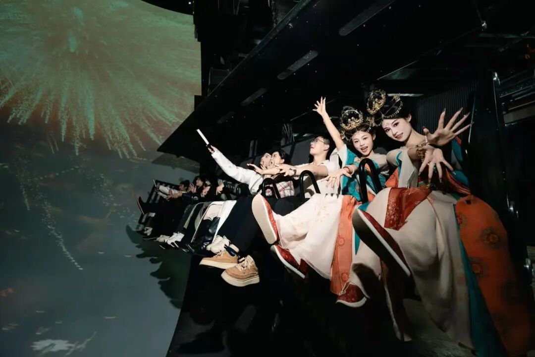 产业发展方面,“唐诗+文旅”融合模式释放强大发展动能。曲江飞行剧院营销副经理宋泽群介绍,剧院一层“长安光域”将诗词书画与AI科技深度结合,通过李白、胡姬等NPC互动表演,让游客更真切地感受诗词活化的意象;二层观影区以李白、杜甫、王维等诗人的17首唐诗为创作蓝本,“以飞行视角带领观众领略这座千年古都的历史底蕴与当代风采”。依托180度球幕投影、全息影像、多声道环绕音效及动感座椅等多元技术,剧院为游客打造了穿越古今长安的沉浸式体验。