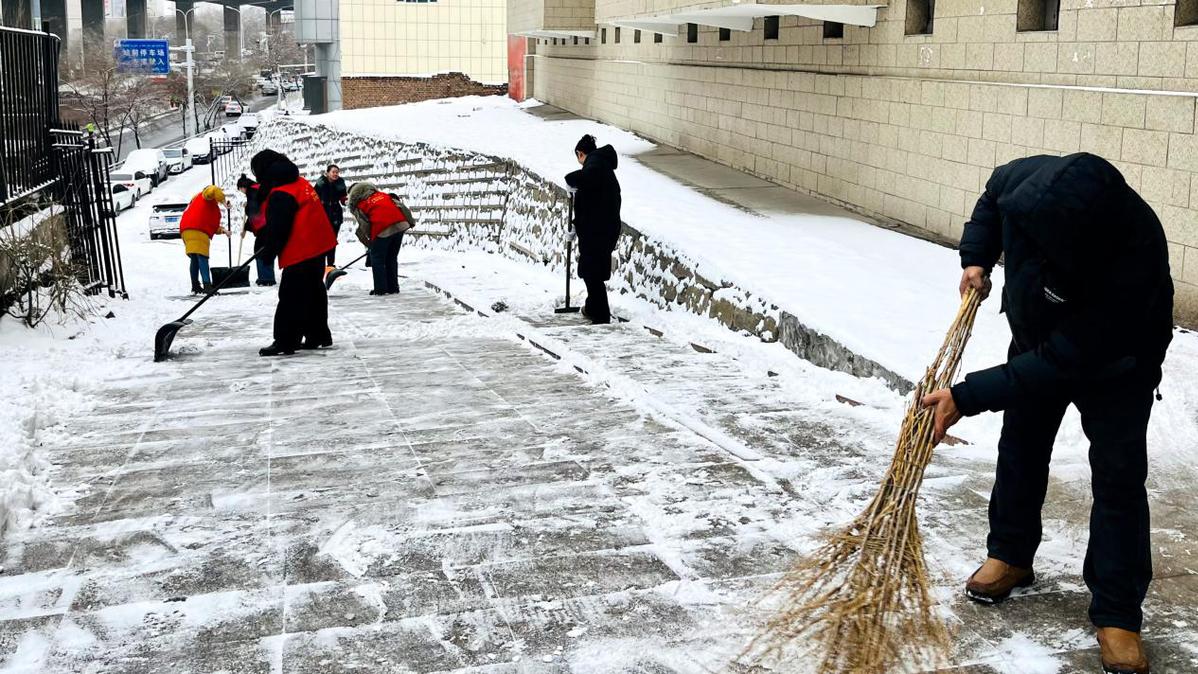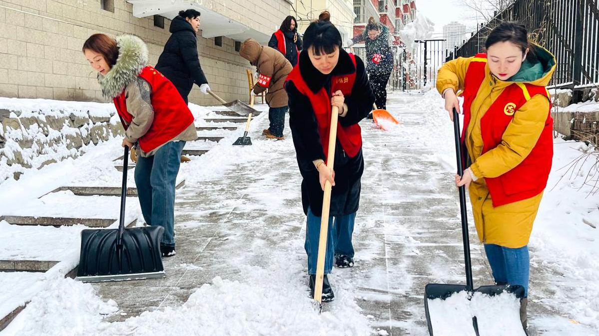 此刻,一支由南站社区新时代文明实践站与沙依巴克区委党校组成的志愿队伍已整装待发,大家分工明确、配合默契。面对道路上厚实的积雪,力气大的志愿者率先用铁锹将雪铲松、堆成雪堆,再由其他志愿者用扫帚将零散积雪扫向道路两侧;遇到结冰路段,大家便用铁锹尖端小心凿击冰层,一点点将冻硬的冰块敲碎,再合力清理到路边。铁锹砸向冰面的“咚咚”声,扫帚划过积雪的“唰唰”声,瞬间唤醒了寂静的街巷,志愿者们忙碌的身影成为雪中一道温暖风景。尽管双手冻得通红,衣帽沾满雪花,但看到一条条干净的道路逐渐显现,大家的脸上都洋溢着欣慰的笑容。