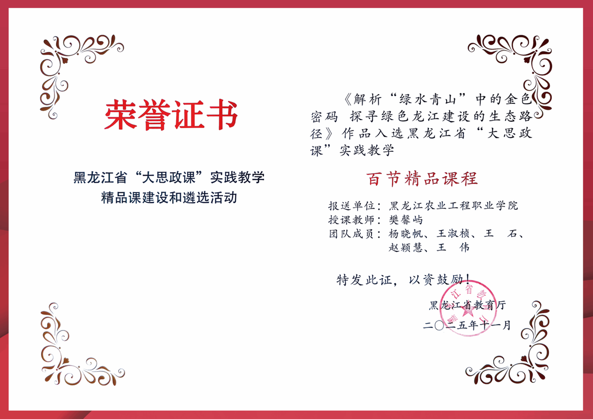此次课程入选是对学校思政教育工作的充分肯定,更是推动思政课高质量发展的重要契机。未来,黑龙江农业工程职业学院将深入贯彻落实黑龙江省“打造‘黑土地上的精神力量’大思政品牌”的建设要求,进一步挖掘龙江生态资源、红色资源、民俗资源中的思政元素,持续推动思政课在内容创新、形式优化、方法革新上下功夫。通过不断完善“三全育人”大思政格局,让思政课更具时代感、亲和力和针对性,引导广大青年学子在感受龙江发展、参与生态建设中坚定理想信念、练就过硬本领,为培养担当民族复兴大任的时代新人、助力龙江绿色发展和教育强省建设奠定坚实思想基础。(中国日报黑龙江记者站 编辑:周慧颖)