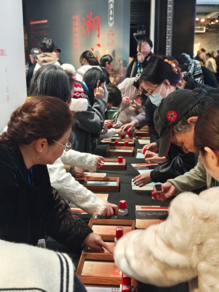 本次展览最吸睛的,莫过于精心设置的“印、制、书、香”四大互动体验区。这里成为了全场最具人气的焦点,每个区域前都大排长龙,场面火爆。 在“印·方寸本草”区,观众们争相亲手钤印两百枚中药篆章,将草木之名化作雅致书票,体验方寸之间的匠心。