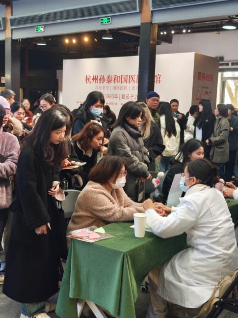 尤为值得一提的是,现场由杭州百年老字号孙泰和国医国药馆开展的“博物馆里把个脉”公益义诊活动,将活动推向了另一个高潮。义诊区被市民层层围住,等候把脉问诊的队伍井然有序却绵长不绝。