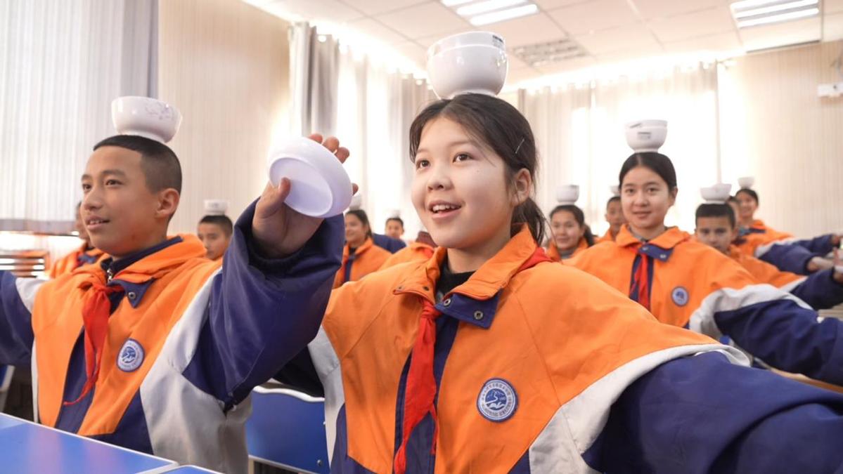 12月9日课间,在阿克吾斯塘乡中学八年级(3)班教室内,音乐老师汪画梅正在带领同学们跳顶碗盘子舞,同学们手拿盘子,头顶着碗,伴随着现场音乐和盘子敲击的节奏,舞蹈表演精彩非凡,在扭脖子和身体晃动的情况下,碗在孩子们头上稳立不动,动作整齐有力,精巧的技艺让人赞不绝口。