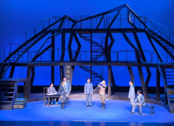 《铸魂天山》以其精美的舞台设计与创新的情节叙事手法,共同构筑起内敛而富有张力的视觉美学,让红色叙事在场景与情感中更具有感染力。在舞台设计上,舞台空间以八路军驻新疆办事处木构架建筑为灵感,将天山山脉线条抽象为结构化造型,通过三层框架式立体平台、贯通上下的旋转楼梯,搭建出具有时代质感与史诗气息的表演场景;横幅、地图、标语、等极具年代特色的小物件与舞台的布景道具交相呼应,既精准还原了当时陈潭秋和新疆“八办”同志在革命时期的生活与工作场景,也为塑造人物提供了真实的环境支撑,通过舞台灯光的明暗交换,即暗喻了在盛世才掌权期间其摇摆不定的人物性格,也凸显了陈潭秋和新疆“八办”同志们在艰难复杂的局势下为党的事业四处奔波,不屈不挠的革命斗争精神。在情节表达上,该剧突破性地采用时空重组的蒙太奇手法,在演出的第五场,盛世才派副官汤执权提前对陈潭秋与王韵雪实施抓捕,陈潭秋在与王韵雪进行 “生离” 的真实时空里,融入了与亡妻 “死别” 的虚拟回忆,构建出真实、虚拟、混合三重时空交织的戏剧场景。舞台设计的结构性与情节设计的创新性相辅相成,前者为情感表达提供了沉浸式载体,后者让作品的视觉呈现更具有精神属性,二者共同赋予了剧目“形神兼备”的艺术魅力,让这段红色故事在视觉美与舞台美的呈现中更容易被观众所感知和铭记。
