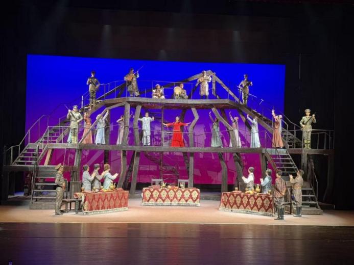 同时,该剧以“创新性发展“为动力,在音乐设计上将新疆地域音乐元素进行深度结合,通过将新疆特有的切分音、附点节奏与黄梅戏五声音阶框架融合,在搭配上新疆弹拨尔的弹拨节奏,产生出地域相互交融的艺术效果。配器上以主胡、琵琶等传统乐器为核心,加入手鼓、弹拨尔、纳格拉鼓萨塔尔琴等新疆乐器,在第三场陈潭秋与王韵雪的婚礼现场,通过和各族群众的互动,手鼓的轻快节奏与笛子的黄梅戏旋律相互交织,既贴合了边疆的历史背景,又象征鄂疆两地之间的群众文化交流。同时,该剧在保留了黄梅戏传统唱腔的基础上,又融入了现代音乐元素,将戏曲与歌舞剧、话剧艺术融合,如新兵营训练场景中,以交响乐编排强化气势,配合三行唱腔的急促节奏,给观众营造出激烈昂扬的氛围;第六场烈士就义的场景中则通过运用管弦乐与黄梅戏唱腔,来升华革命烈士坚贞不屈,不畏艰险的创作主题。通过借鉴现代音乐的节奏处理模式,让平词、二行等唱腔的转换衔接更加流畅,即满足了在场观众的审美需求,也为传统戏曲的创造性转化及创新性发展开辟了新的时代路径。