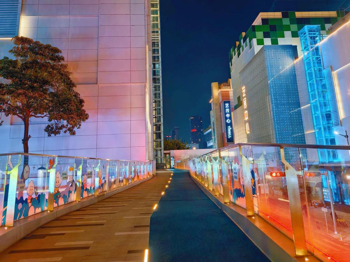 据承建单位中建深装介绍,该项目没有“大拆大建、封街改造”,而是采用“老瓶装新酒”的改造方案。可交互式的裸眼3D屏扮靓建筑外立面,构建沉浸式消费体验,人行道隔离护栏分类处置49个占道公共设施箱体,实现“还路于民”。结合贯穿南北的空中连廊和空中广场,800米的星光跑道嵌入3000米的云街,不仅大幅提升了居民夜间出行、健身的安全性,更实现了20多个商业中心和总部经济中心、1万多平米沿街商铺的互联互通。作为罗湖建筑屋顶改造的三个试点片区之一,项目充分美化、活化利用第六立面,一批街角公园小品、健身设施有机嵌入城市肌理。将地铁冷却塔等基础设施转化为公共艺术装饰品,盘活更多城市空间的同时,也进一步提升了美学价值。