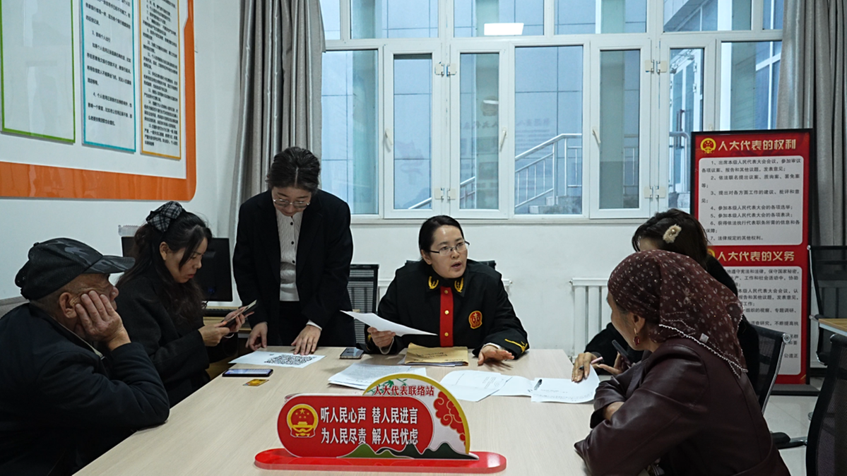 图为办案法官古丽孜拉·排祖拉面向双方当事人,耐心展开调解画面。(邓佳怡摄)
