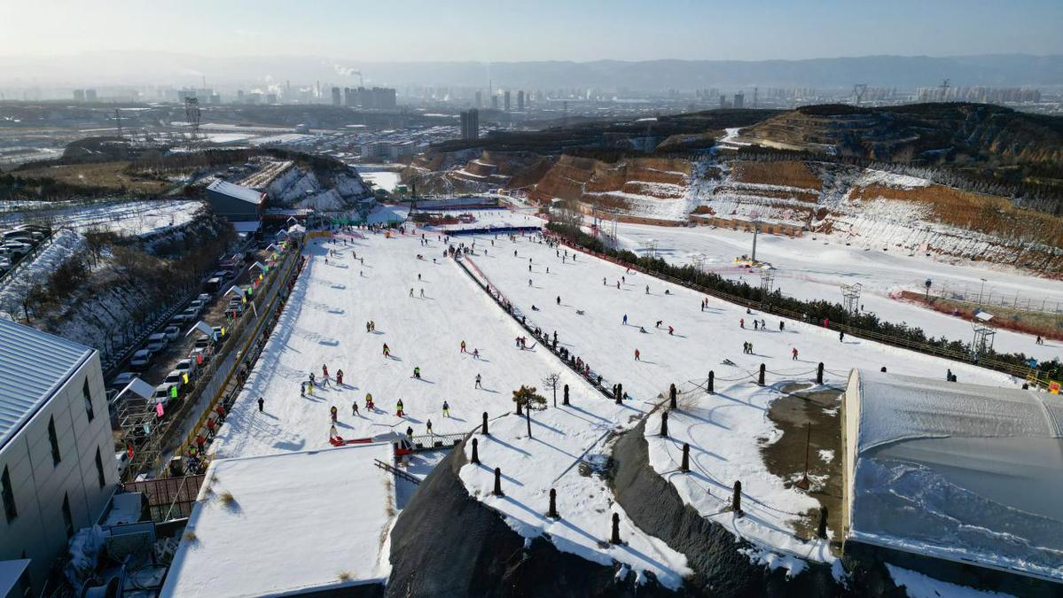 12月13日,人们在山西省太原市采薇庄园滑雪场滑雪(无人机照片)。朱兴鑫 摄
