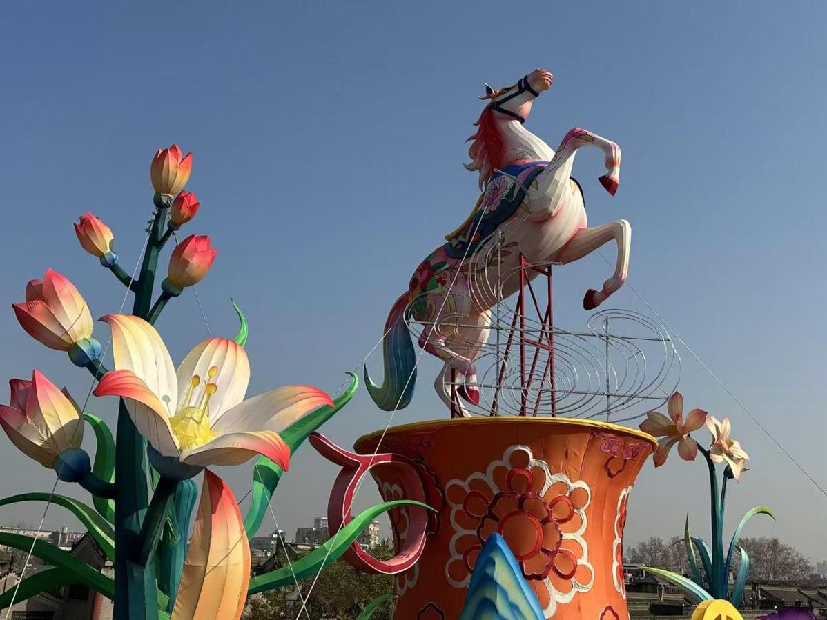 紧扣丙午马年主题,灯会从历代文物、经典书画中甄选39匹形态各异的“生肖马”符号,通过“翼马行空”“舞马盛唐”等灯组还原不同时代马的神韵。“每组花灯都力求还原不同时代马的神韵,既凸显了生肖文化的深厚内涵,也传递了昂扬向上的新春寓意。”制灯美工师王郑杰介绍,彩灯制作从焊工造型到安装调试需两个月,如今已向“形、色、声、光、动”方向发展,让游客能与灯组产生趣味互动,让生肖文化在光影中可感可触。