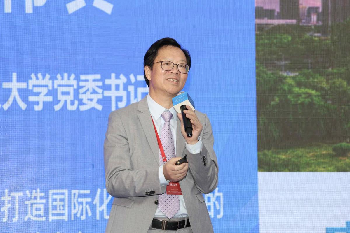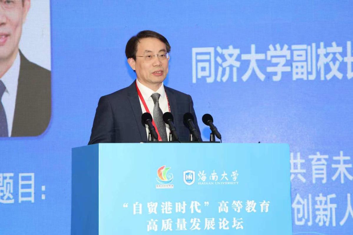 (同济大学副校长许学军作题为《融合创新 共育未来 同济大学国际化拔尖创新人才培养路径》的主旨报告 高可贺摄)
