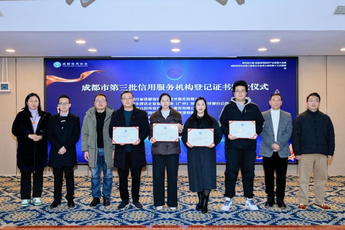 为规范信用服务市场秩序,提升行业整体服务水平,成都信用协会在2025年开展了成都市第三批信用服务机构自律登记工作,经过严格审核,共有7家机构符合条件,在大会上为服务机构发放了自律登记证书。