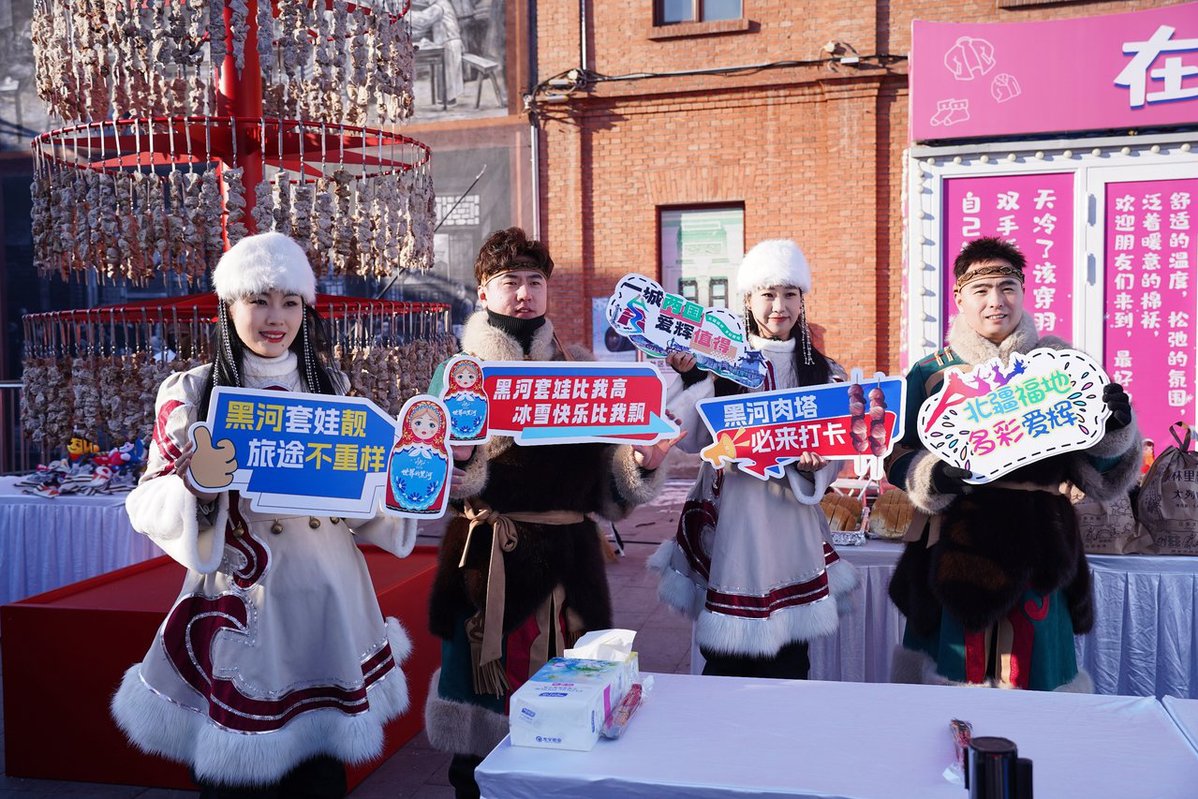 在众多镜头与目光的聚焦下,红绸轻落,彩球腾空,打开巨型套娃的门扉,内部陈列将黑河风情一览无余。“我们带着黑河的诚意,以套娃为信,来到哈尔滨这座流淌着中西文化的街区。”市文广旅局相关工作人员介绍说,黑河与俄布市隔江相望,拥有独特的文化底蕴与开放姿态,此次将文旅会客厅“搬”至哈尔滨,不仅是一次温暖的推介,更是携手打造“温暖龙江”名片,深耕“下一站黑河”消费心智的有力举措。