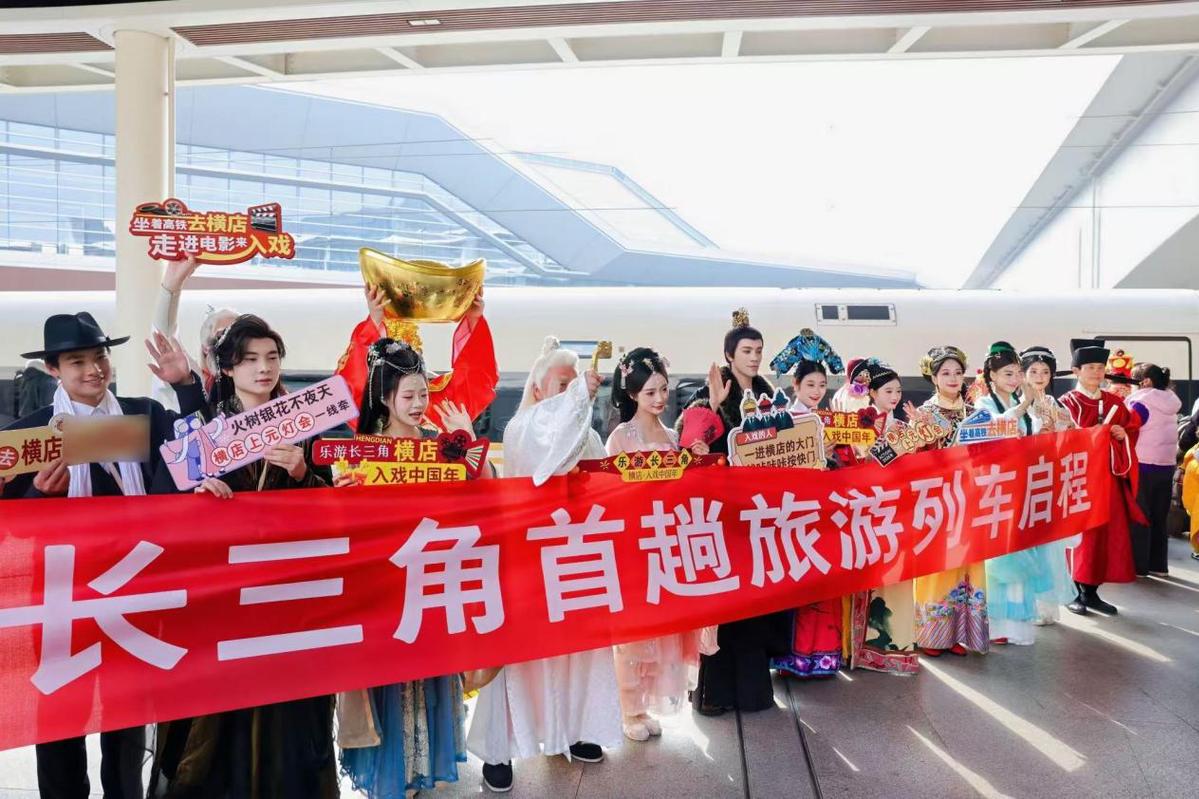 1月18日上午,苏州南站候车大厅一派热闹景象——古风装扮的演员穿行于旅客之间,笑意盈盈地邀请合影、互动打卡;智能机器人、机器狗组成“科技萌团”,灵动穿梭,与演员联袂演绎创意快闪。10点41分许,2026年首趟“乐游长三角”影视旅游列车从苏州南站鸣笛启程。C3611次列车载着200余名特邀体验官驶向横店,不仅将旅途变为沉浸式影视片场,更奏响通往横店年度盛事的精彩序曲。