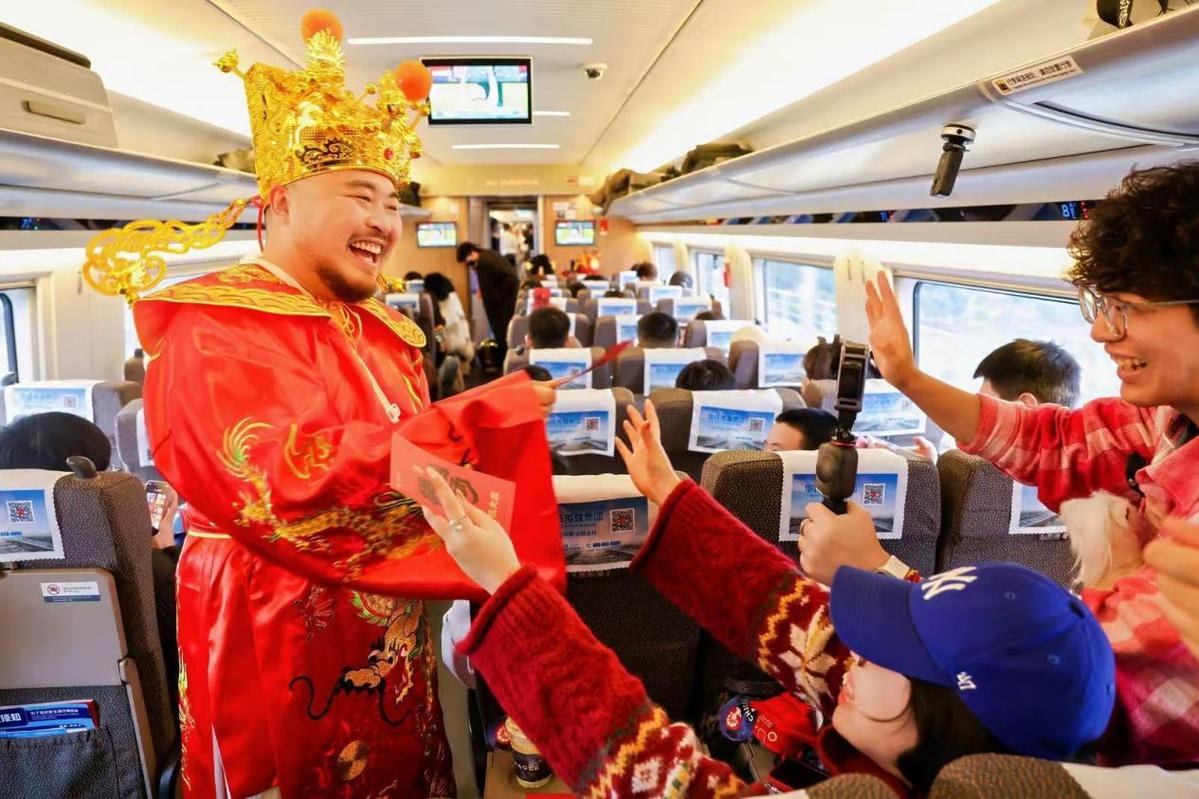 本次列车中4节车厢化身移动“片场”,“财运星君”“福寿星君”“姻缘星君”“文曲星君”等各色“心愿官”纷纷登场,在车厢内展开趣味互动。旅客通过完成“接福任务”积累“福气值”,提前点燃新年的欢乐与期待。活动还与知名茶饮品牌“霸王茶姬”展开跨界联动,共同推出限定“戏精茶票”刮刮卡,打造“戏精茶话会”互动体验。