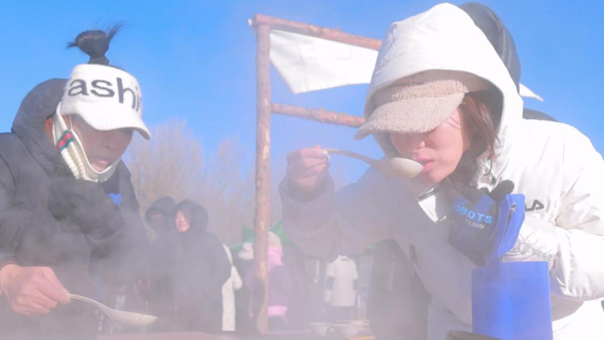 嘉年华现场气氛热烈,四大主题区域各具特色——在体育赛事与冰上体验区,冰车竞速、冰上拔河、冰壶等趣味赛事,以及钩机雪圈大回环、雪地拉车、冰钓等项目吸引了大量游客互动体验,实现了零门槛参与、全年龄段覆盖,让游客在竞技与娱乐中感受冰雪运动的独特魅力。民俗大集区汇集圣一冰麦、洮之宝杂粮、敖牛山小米、万宝粉条等洮南本土优质农产品及烤地瓜、冰糖葫芦、冻梨等传统东北冬日小吃,让游客在选购年货、品尝美食中感受浓郁的烟火气息与地方产业活力。渔猎冬捕区作为核心亮点,生动再现北方传统渔猎文化的震撼场景,鲜鱼破冰打捞后大锅烹制,搭配现蒸粘豆包,让游客在品尝“第一口鲜”的同时,感受到视觉与味觉的双重盛宴。综合体验区则通过"移动大篷车"文艺演出、户外秧歌表演、冬日露营等多元业态,打造了全天候、全时段的文旅活动场景,特别是乡村"村晚"的精彩呈现,以群众喜闻乐见的形式展示了洮南本土文化的独特魅力。