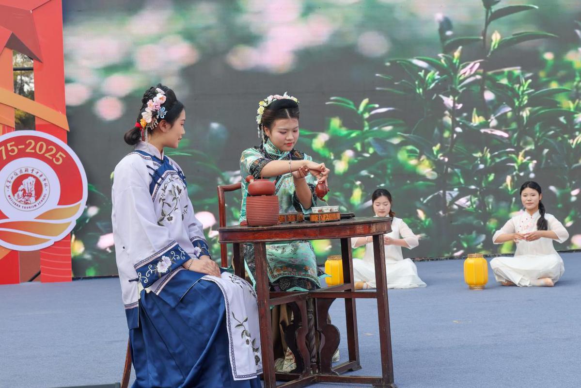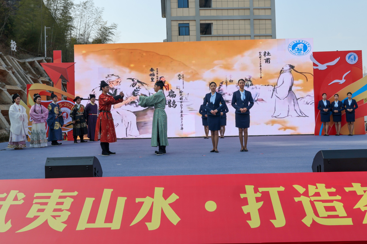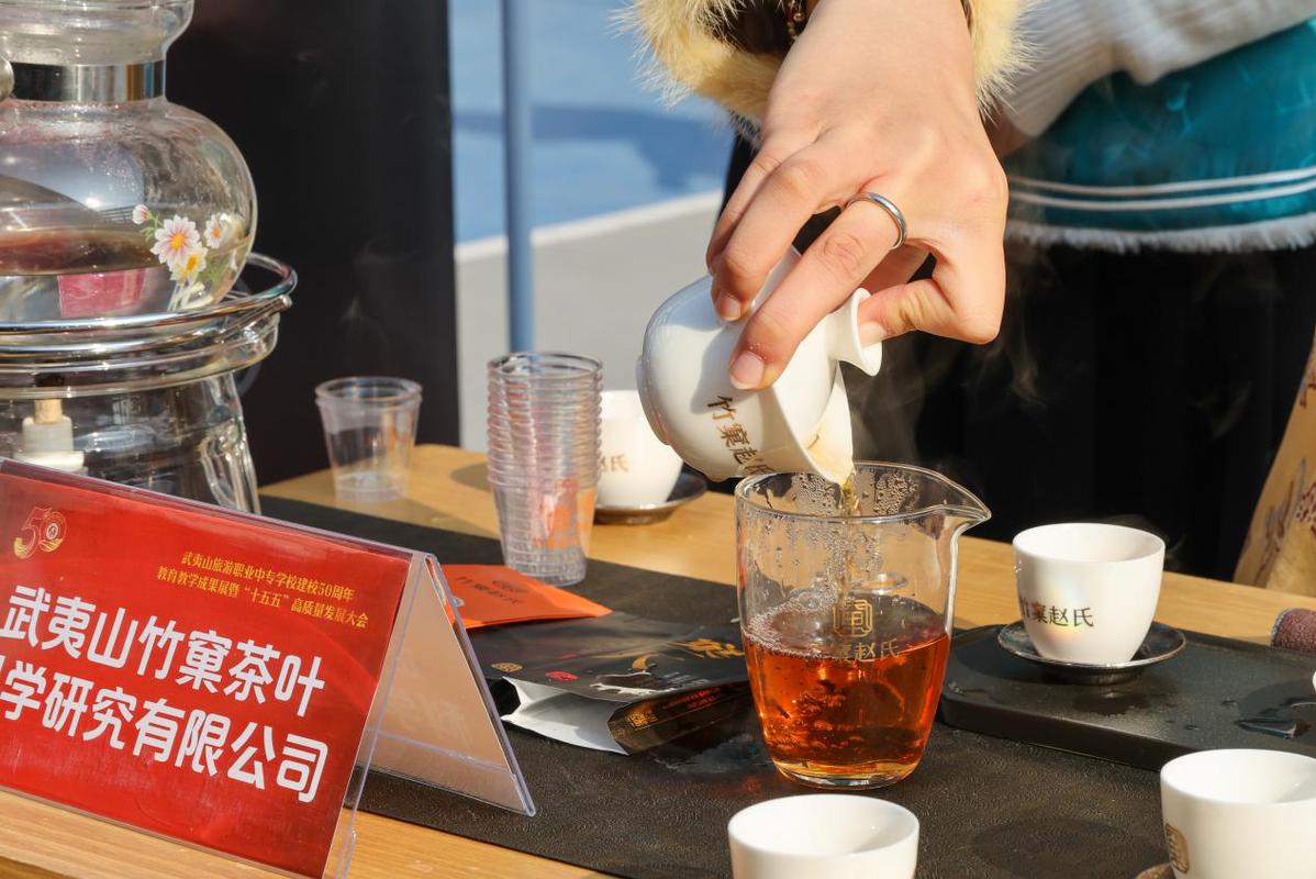 当日,武夷山旅游职业中专学校举办建校50周年教育教学成果展,集中展示以茶专业、旅游专业为核心的办学特色成果,彰显学校深厚文化底蕴与办学积淀,充分呈现学校开办的六大专业在服务地方茶文旅产业、深化产教融合、创新人才培养模式等方面的显著成效。展区设置茶席体验、英式下午茶体验、新式调饮展示、点茶体验、厨艺主题浮雕展示、茶宴及特色菜品展示、餐厅摆台与折花创意展示、导游拓片互动、茶叶盲品、电商成果展示等特色专业互动体验项目。