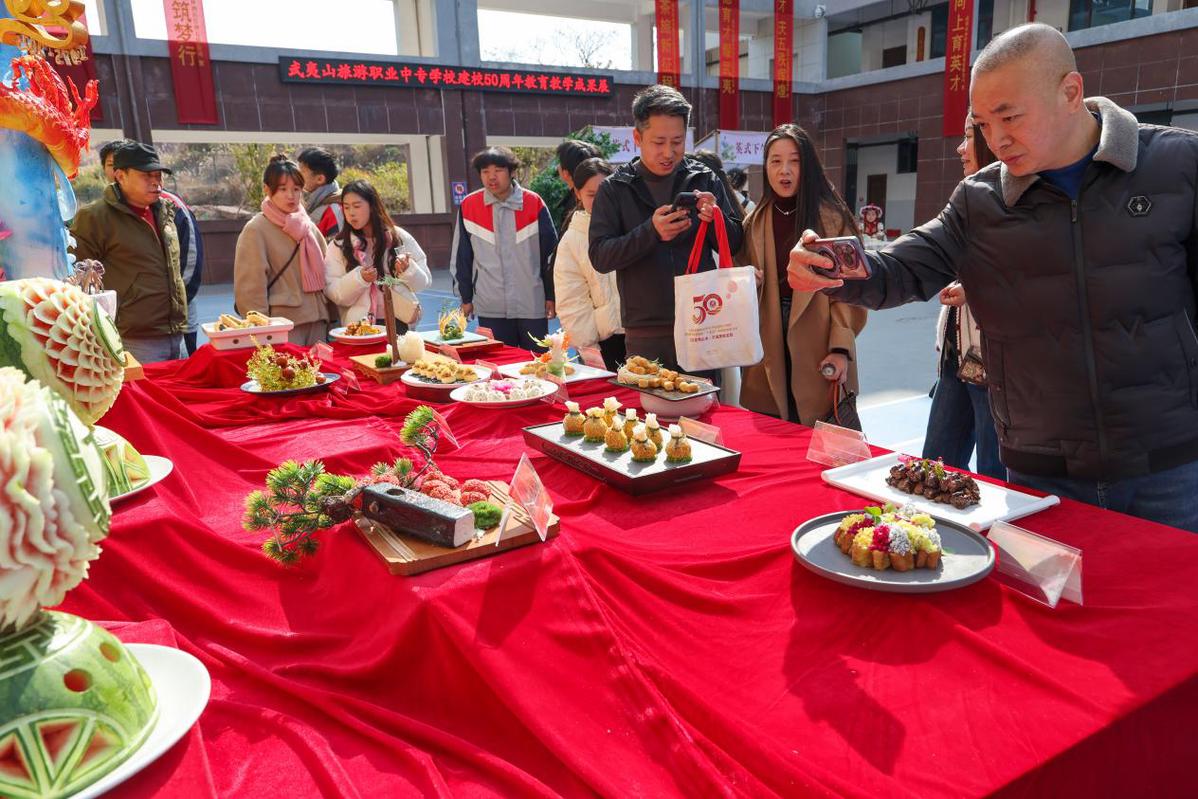 1月16日,与会校友在武夷山旅游职业中专学校建校50周年教育教学成果展上参观厨艺主题浮雕及菜品。(邱汝泉 摄)