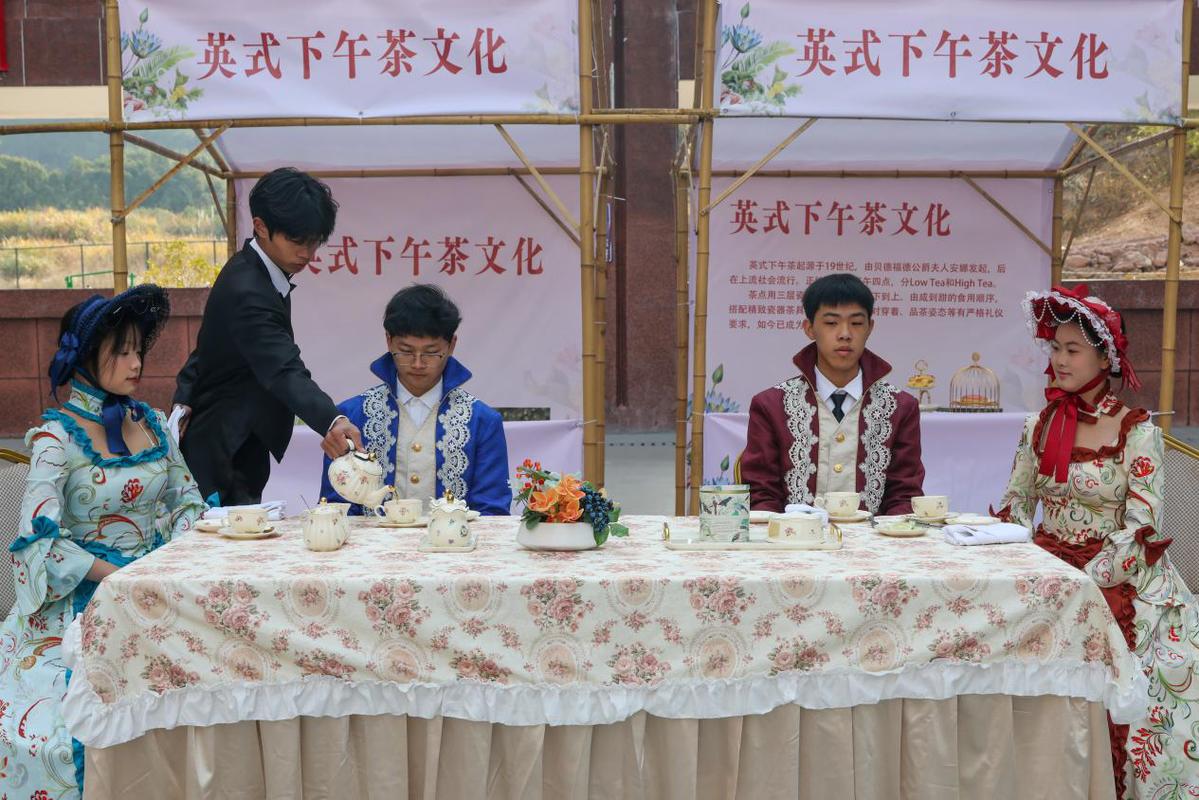 1月16日,武夷山旅游职业中专学校学生在建校50周年教育教学成果展上表演英式下午茶。(邱汝泉 摄)